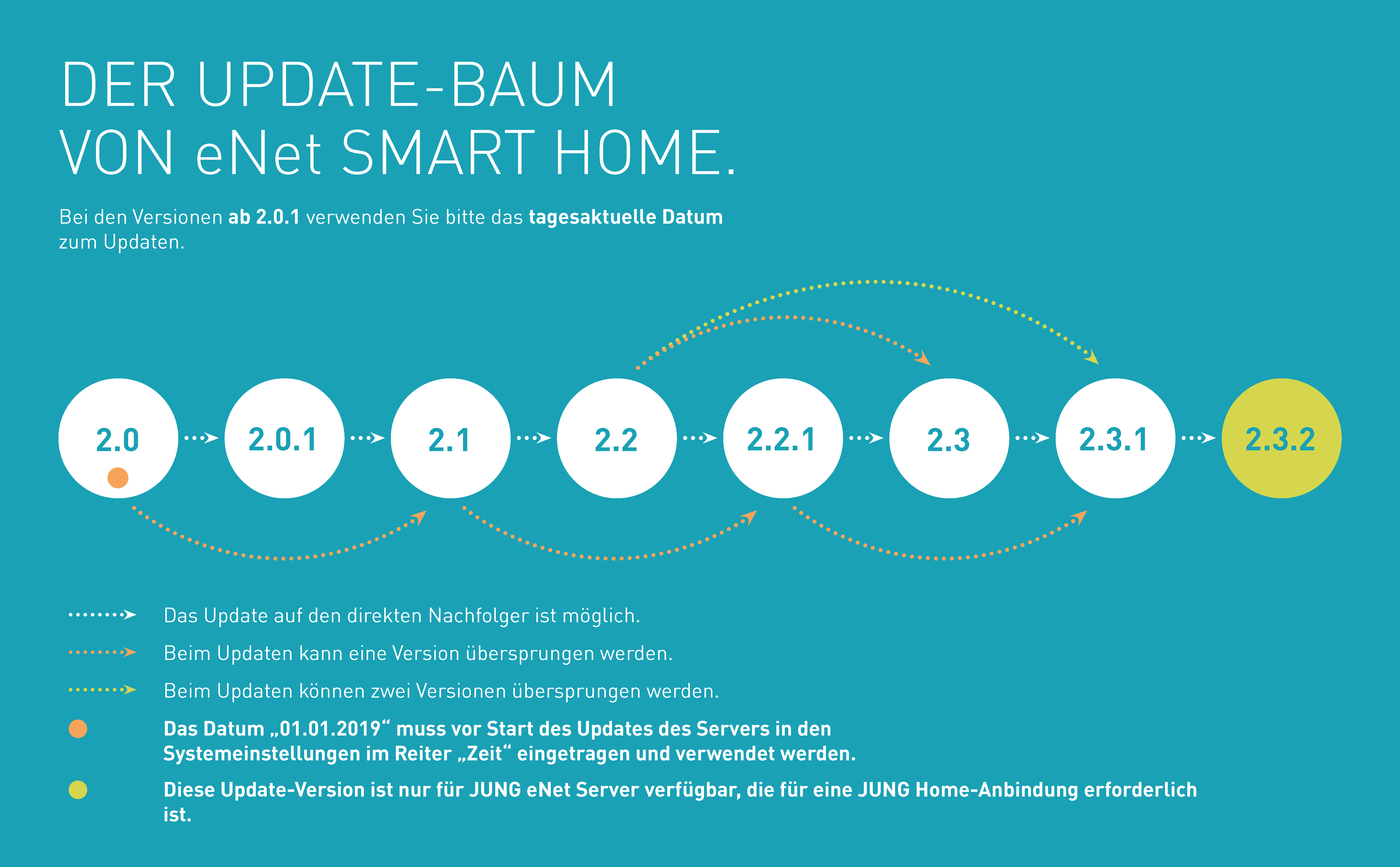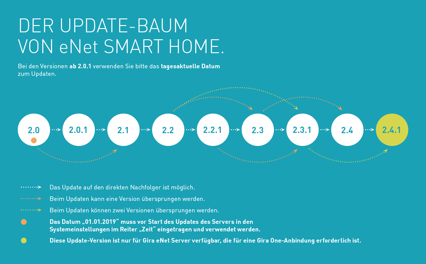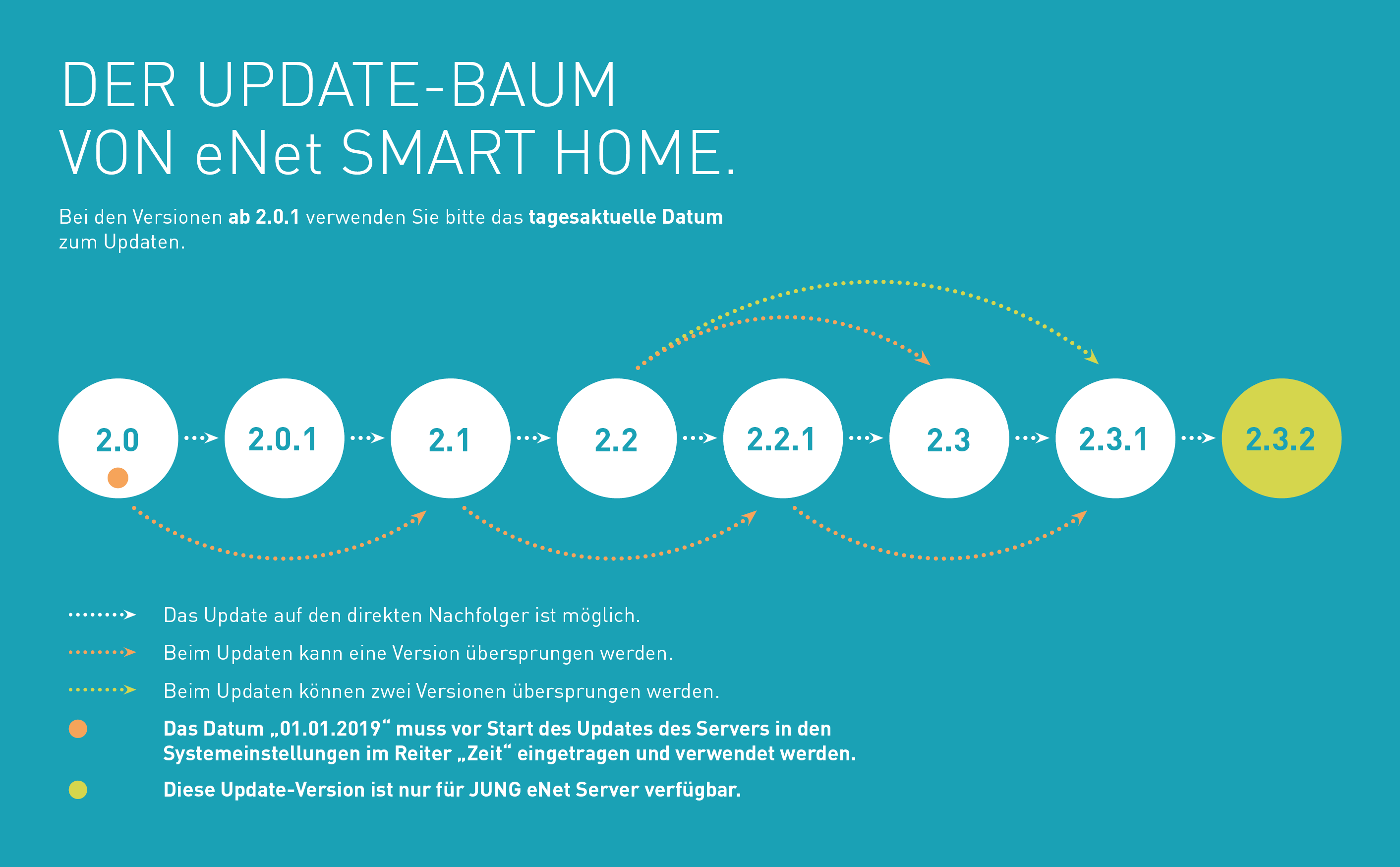 Bitte beachten Sie hierzu den obenstehenden Update-Baum für einen erfolgreichen Update-Vorgang. Installieren Sie zudem die aktuelle Version der eNet SMART HOME App für Android bzw. iOS auf Ihrem Smartphone oder Tablet.